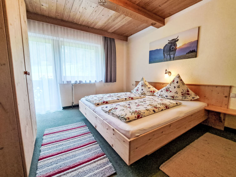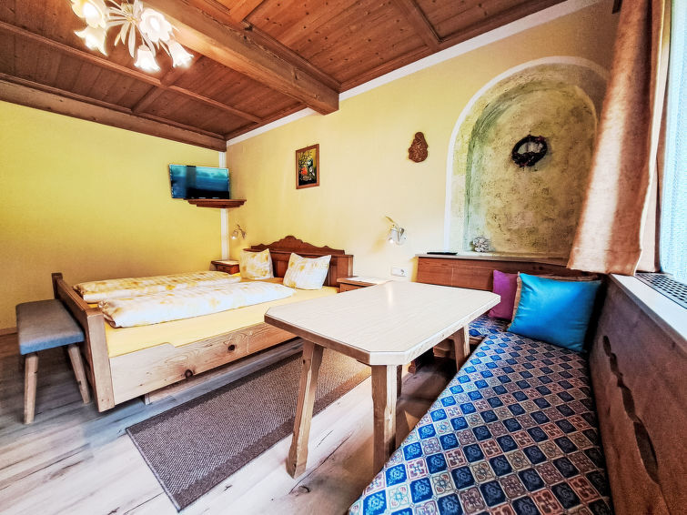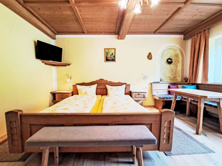 "Trojer", apt 5 pièces 120 m2. Aménagement agréable et avec beaucoup de bois: 2 chambres doubles, chaque chambre avec: douche/WC. Sortie sur le balcon. 1 chambre double. 1 chambre avec 1 lit, 1 lit double et douche/WC. Grande cuisine/séjour (four, 4 plaques vitrocéramiques, micro-ondes, congélateur, cafetière électrique) avec table pour les repas. Douche/WC. 2 balcons. Très belle vue sur les montagnes. A disposition: lit bébé. Gratuit. Veuillez noter: logement non-fumeur.