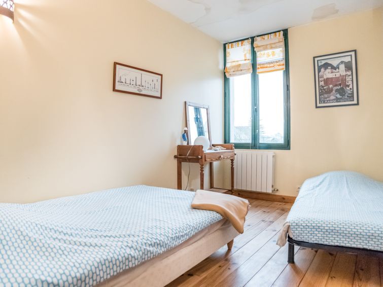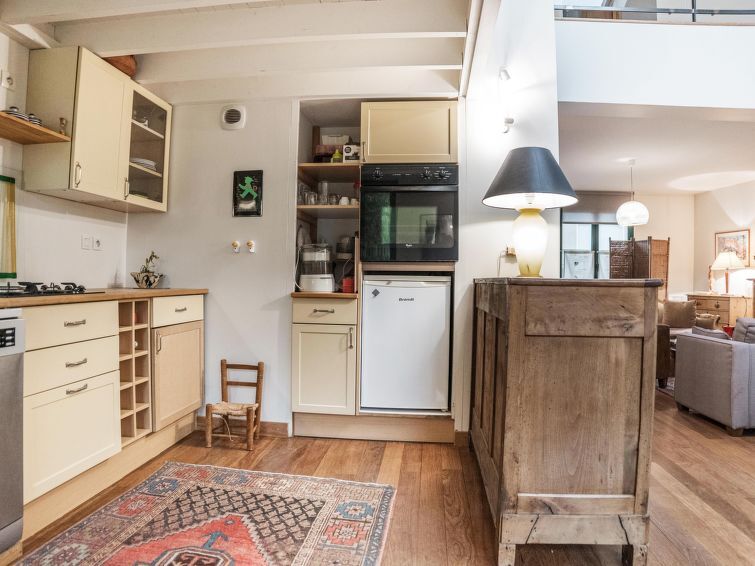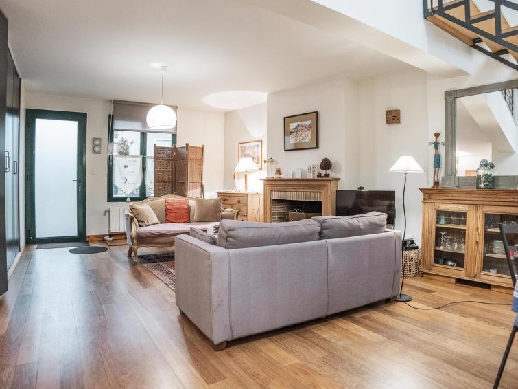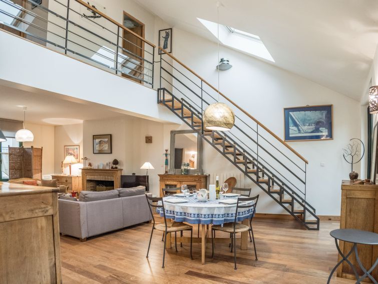 "Camélia", maison mitoyenne 3 pièces 80 m2 sur 2 niveaux. Spacieux et clair, complètement rénovée, aménagement confortable et de bon goût: grand séjour/salle à manger avec cheminée (uniquement à titre de décoration), TV (écran plat). Sortie sur le jardin. Grande cuisine ouverte (4 plaques de cuisson, four, lave-vaisselle, grille-pain, bouilloire électrique, micro-ondes, congélateur, cafetière électrique). À l'étage supérieur: 1 chambre avec 1 grand-lit (1 x 140 cm, longueur 190 cm). 1 chambre avec 2 lits (90 cm, longueur 190 cm). Douche, WC séparé. Chauffage au gaz. Terrasse 20 m2, jardin 40 m2. Meubles de terrasse. Vue sur le jardin. A disposition: lave-linge, sèche-cheveux. Internet (Connexion WIFI, gratuit). Veuillez noter: détecteur de fumée.