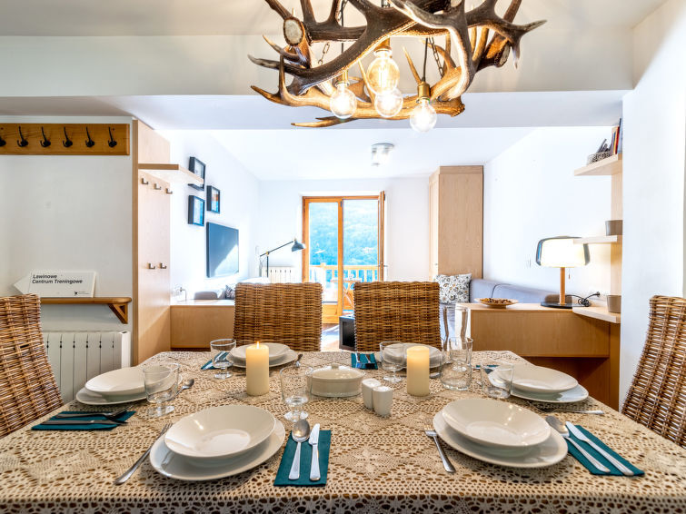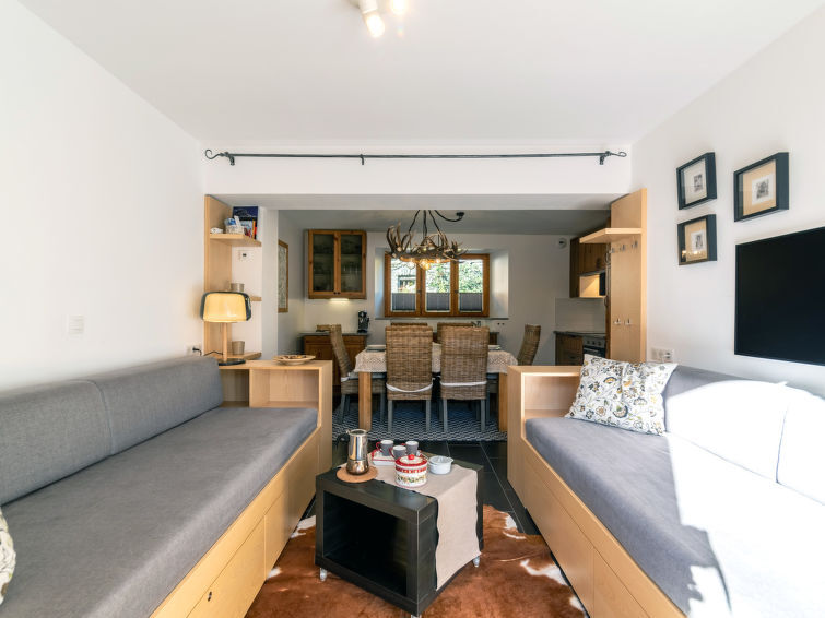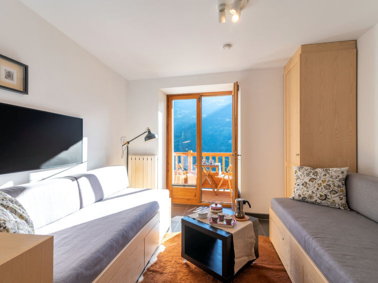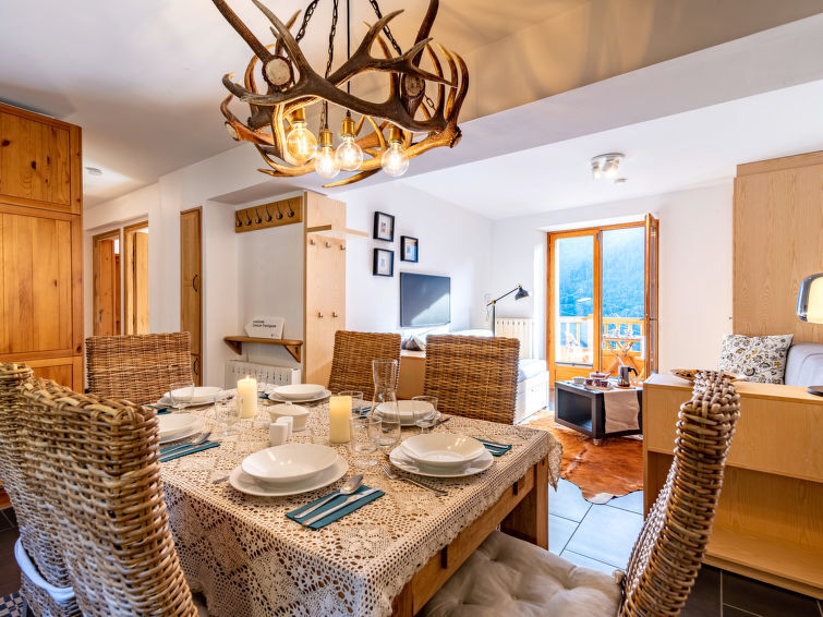 Apt 3 pièces 60 m2, rez-de-chaussée surélevé. Aménagement confortable et agréable: séjour/salle à manger avec 1 divan-lit double (160 cm, longueur 190 cm), TV (écran plat). Sortie sur le balcon, orientée est. 1 chambre avec 1 grand-lit (160 cm, longueur 190 cm). 1 chambre avec 2 lits (80 cm, longueur 190 cm). Cuisine ouverte (four, lave-vaisselle, 4 plaques vitrocéramiques, grille-pain, bouilloire électrique, micro-ondes, congélateur, cafetière électrique, appareil à raclette, service à fondue (fondue au fromage)). Douche, WC séparé. Chauffage électrique. Balcon, situation est. Très belle vue panoramique sur les montagnes et les alentours. A disposition: lave-linge, lit bébé jusqu'à 2 ans, sèche-cheveux. Internet (Connexion WIFI, gratuit). Place de parking (2 Voitures). Veuillez noter: logement non-fumeur. Détecteur de fumée, extincteur.